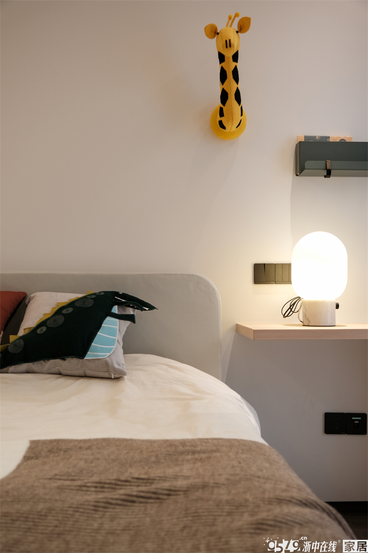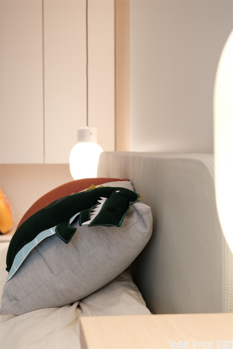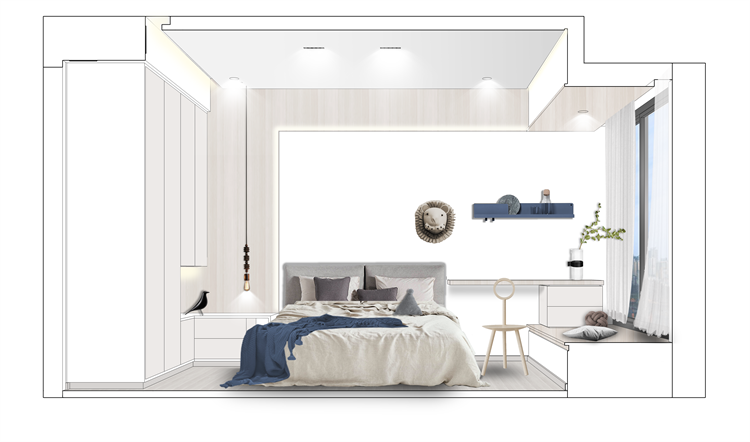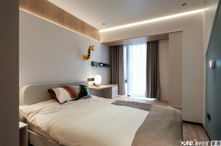 儿童房的需求比较多,要有书桌、有衣柜、有黑板墙、还要拥有生机和活力。带着这些需求,设计师也是交出了完美的“答卷”。书桌连着飘窗一体,,床头背景上方木色连着另一侧的床头柜及衣柜,设计了线性灯带,整体简洁又处处暗藏“心机”。连床品都是精心搭配~蓝色区域墙面就是整块的黑板漆,满足爱涂爱画的需求,释放孩子的天性。