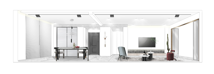 • 入户设计了鞋柜,平板门到顶,中间和底部镂空,呈上中下结构的柜体满足各种需求。为了和整体色调统一,入户门也做了喷气改色,果然效果更好了!从餐厅角度看过来,色彩统一度很高。