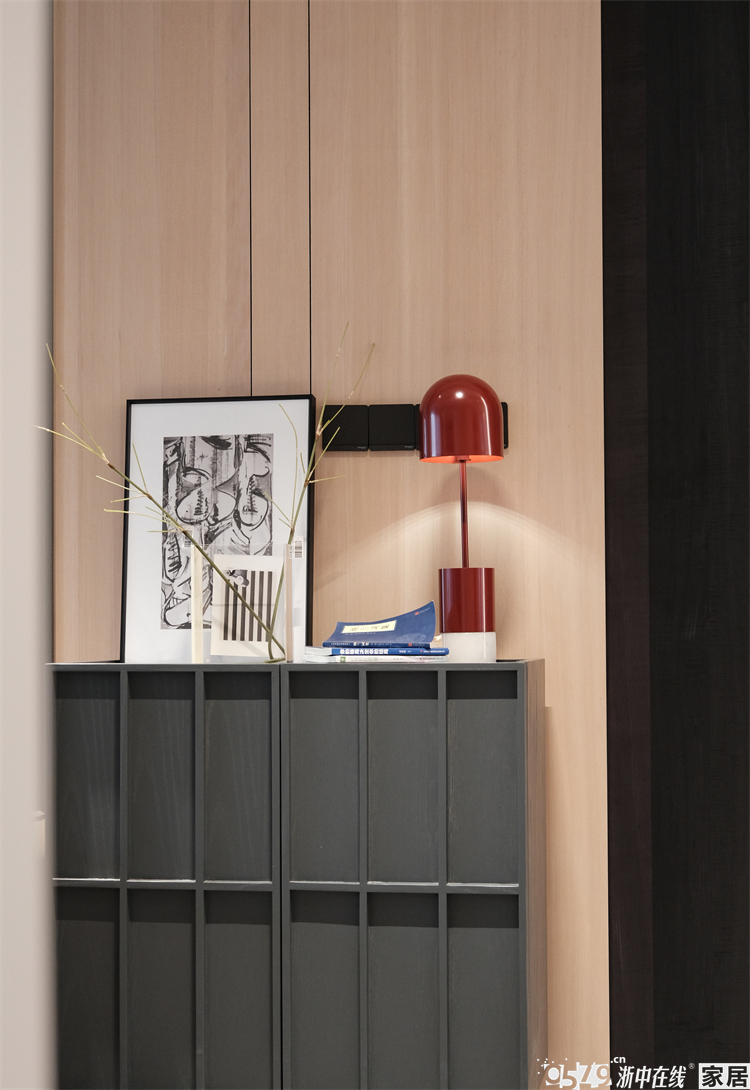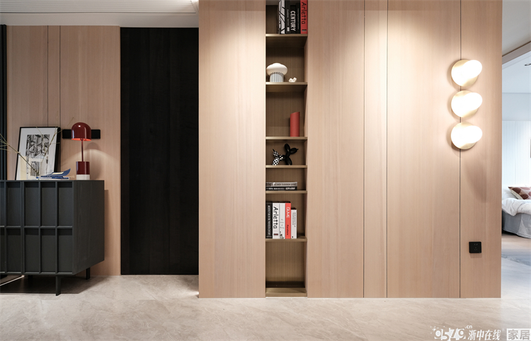 进门正对的方向设计了收纳柜及装饰灯,营造了玄关的感觉,让人眼前一亮!整体木饰面延续到沙发背景,木色、黑色做交叉搭配,碰撞出来的视觉效果超棒!