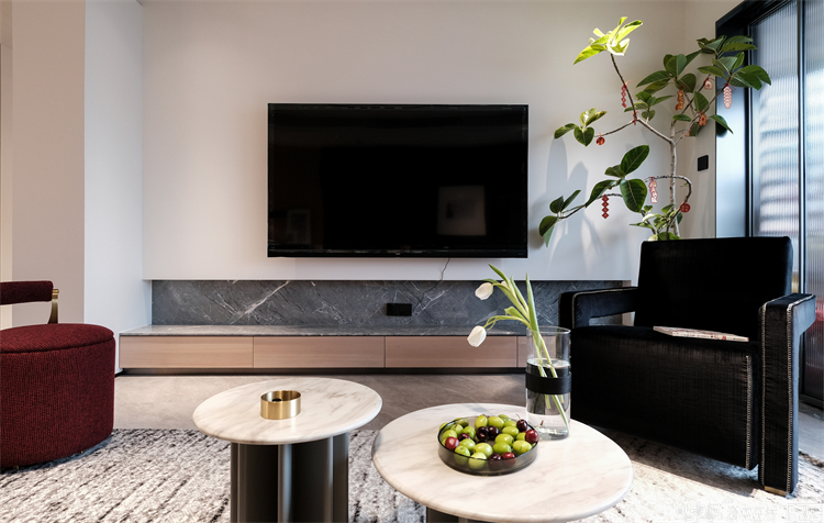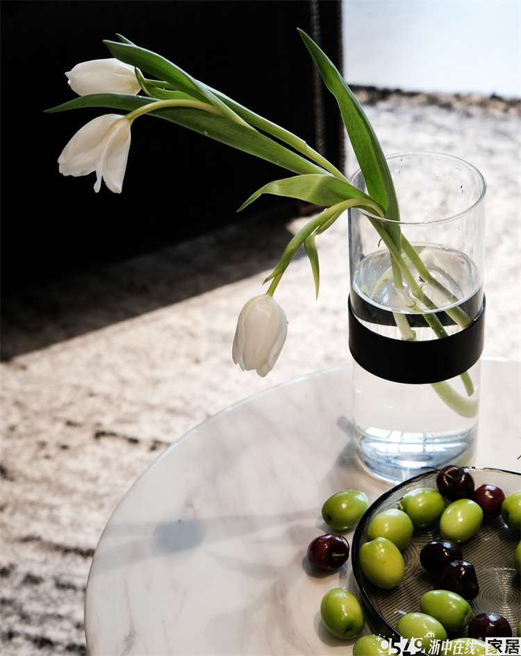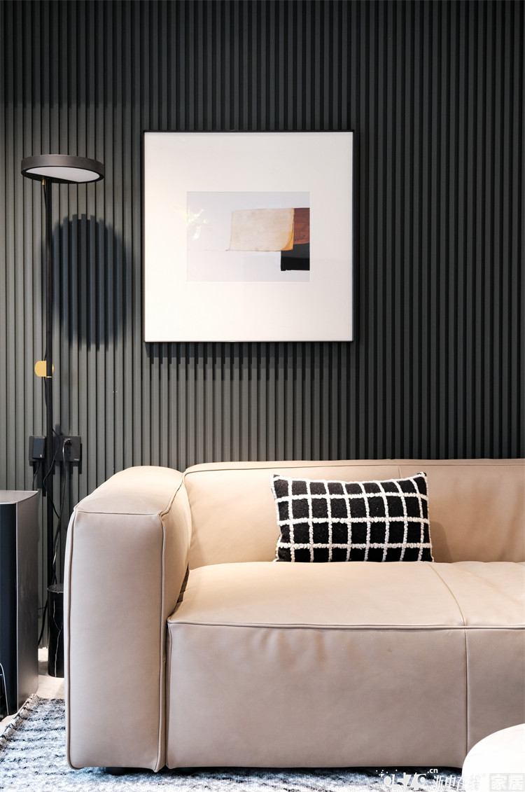 沙发背景是木栅格的一种,采用大面积的黑色也和另一头餐厅区域的边柜颜色多对称,而沙发跟挂画的颜色又刚好做了调和,深浅搭配,每一个色彩的过渡都是设计师经过反复推敲,以求达到最好的效果。
