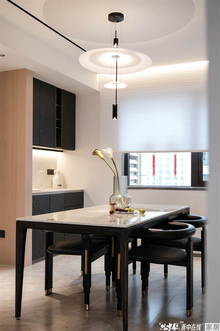 • 餐厅区域是四人位的餐桌,长款吊灯也是完美还原了效果图的设计。靠窗一侧预留了餐边柜的位置,使用上更为方便。窗台做了铝合金的包边,窗帘则选择了蜂窝帘,增强整个家的现代感。