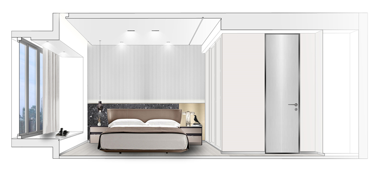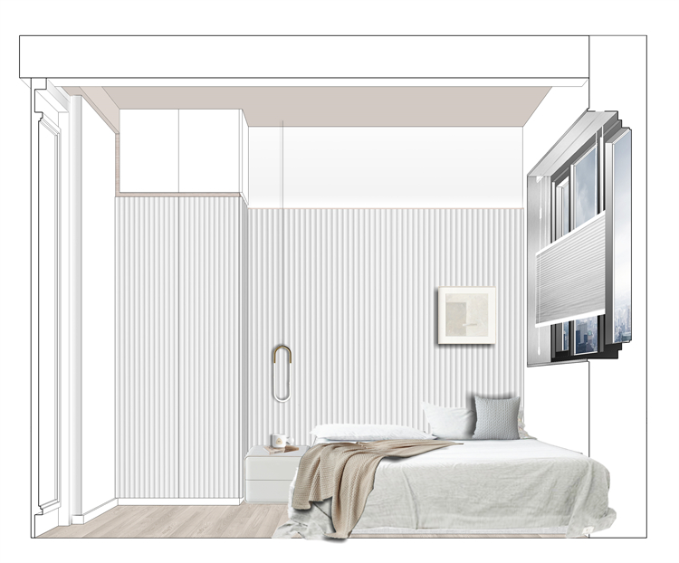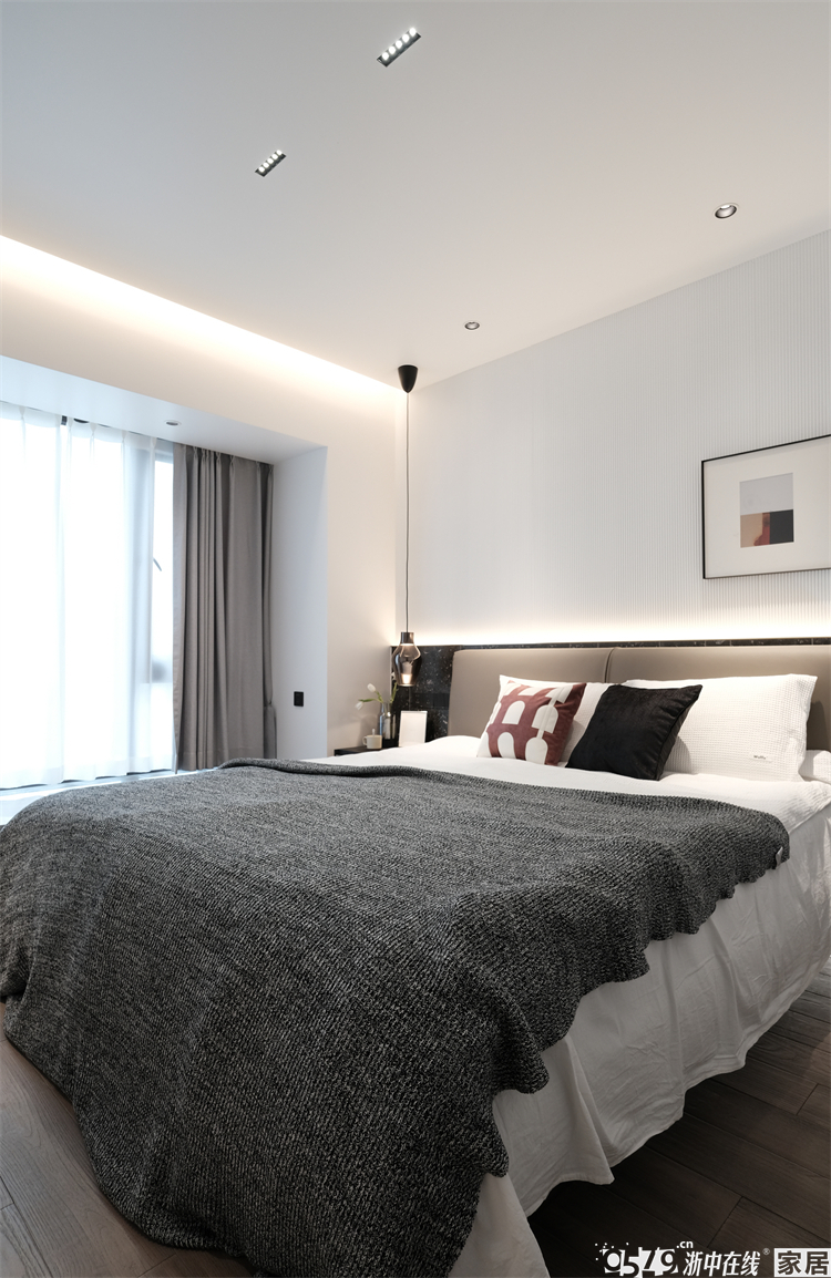 次卧空间相对局促一点,所以把床靠着窗摆放,在原本电视背景的位置设计了书桌及置物隔板,兼具功能性和实用性。床头背景一侧也设计了到顶的柜子,储物空间还是不能少哦。跟客厅一样,次卧也选择了蜂窝帘,遮光效果是可以根据不同空间的需求去选择的,所以不用担心,实物颜值真的很高,和现代感的家极为相配。