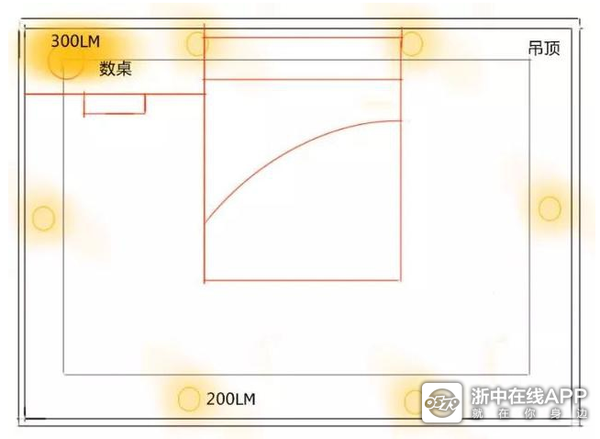 当然在实际情况下,一个10平米的空间不可能装那么多筒灯,这个时候就可以在6个200LM筒灯保证一般活动足够亮的基础上,在主桌角度单独装一个300LM的台灯,因为书桌需要照亮的范围大概是1㎡,这样已经够用了。