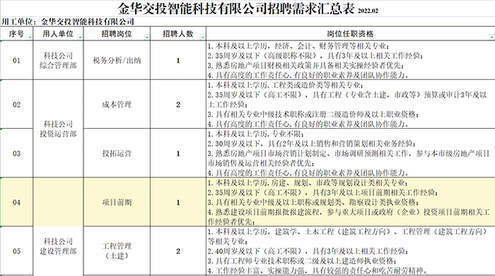 公司积极参与都市新区建设、服务大交通建设,主营房地产开发、销售和经营业务。公司开发建设有交投智能物流装备产业孵化园项目,并基于投资形成资产、开展多种经营模式。金华交投智能科技有限公司现因工作需要,面向社会公开招聘岗位6个,共计人员8名。