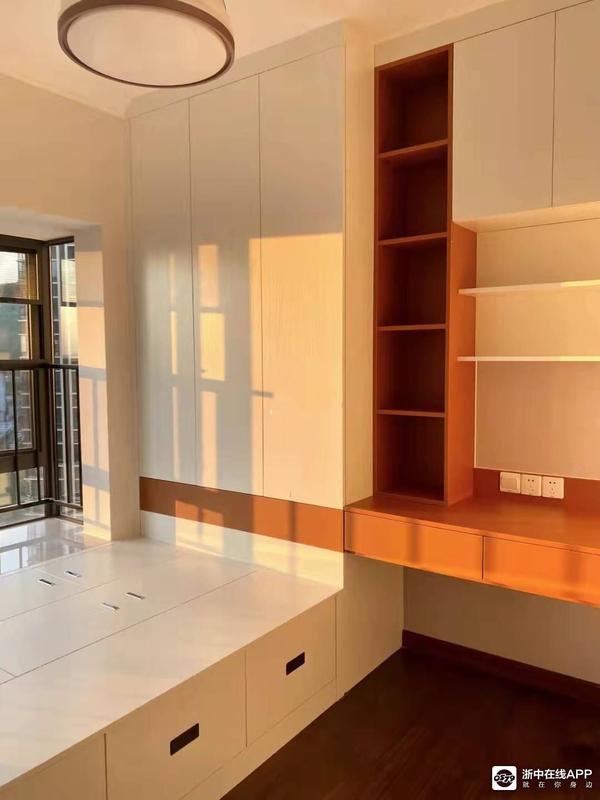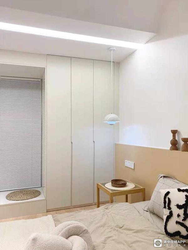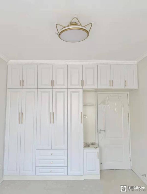 这个是没有做一门到顶的款式,外形上不是最简约,但是胜在使用方便,一般最上面的柜子可以用来放不常用的被子衣物。
