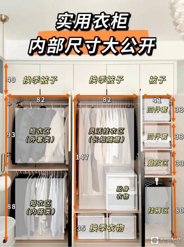 衣柜内部的分区还是需要好好设计一番的,大家记得自己伸手量一下,找到最适合的拿取高度,我记得就有朋友跟我吐槽她家的柜子设计的太高,拿平时要穿的衣物甚至还要踩个小板凳,真的很不方便了!