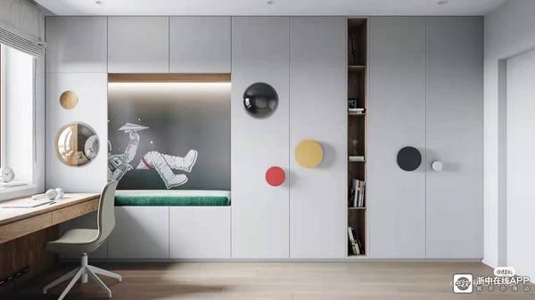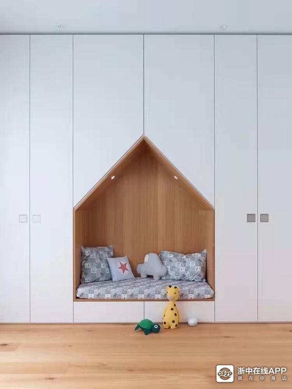 儿童房的全屋定制衣柜造型上可以放弃方方正正,设计成小房子模样也能更可爱,加入一些儿童元素让房间整体更有趣。