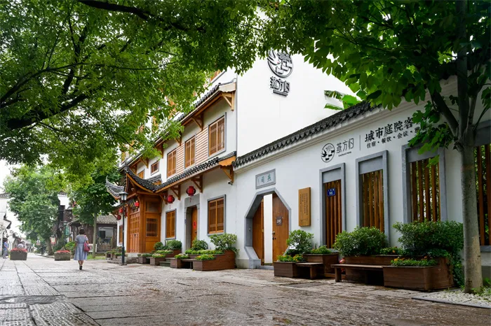燕方归有燕园、客房、茶空间、书院、包厢等多个功能区,建筑风格采用江南庭院独有的白墙黛瓦、曲院层楼,屋檐翘出的马头墙左拥八咏楼,右抱万佛塔。