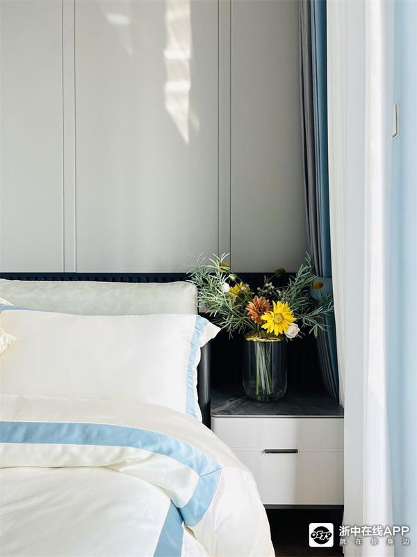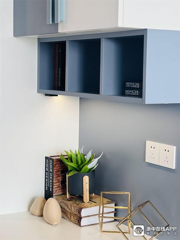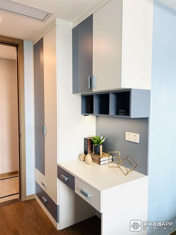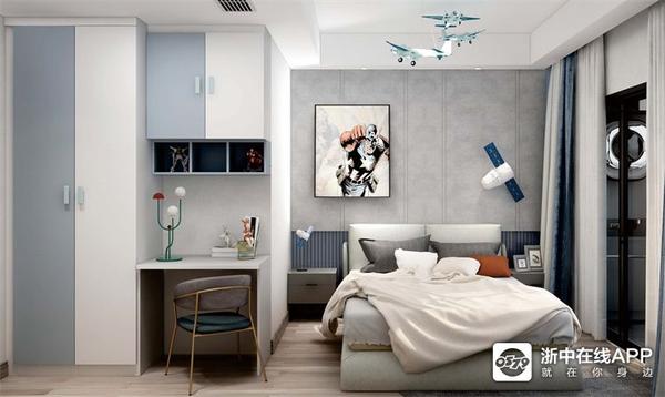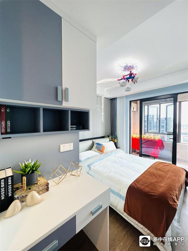 儿子房是蓝白色调,进门就是衣柜+书桌的组合。背景墙做了深蓝色的格栅+硬包,童趣又不失沉稳~一进门就让小金眼前一亮,学起来~