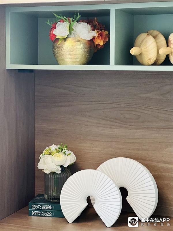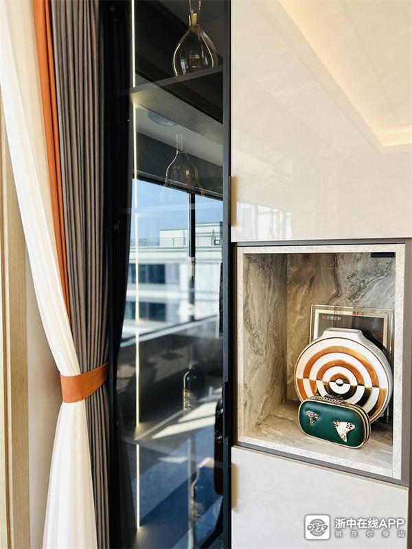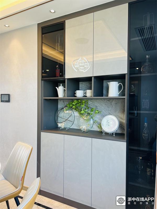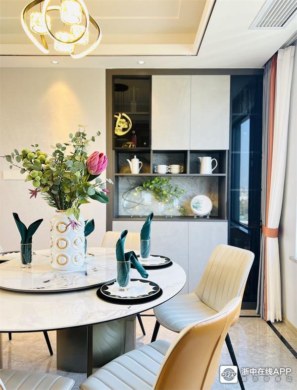 这个户型边套的一个优势就是酒柜可以入墙,不占用餐厅空间,温馨的圆桌也妥妥放下啦~酒柜用的面板和客厅是同系列,色彩保持统一。翡翠冰玉陶瓷面板的餐桌花色也很特别,桌角采用的是不锈钢拉丝的工艺,我专门问了型号(PT2029T),喜欢可以记下直接买同款哦~