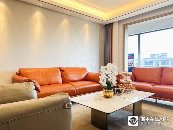 客厅选用的是kuka爱马仕橙的阿尔勒全皮沙发,搭配灰色系的单椅,气场超强。电视背景是定制的组合柜,玛瑙灰+太空灰+玻璃门的配色,简洁大气,展示格做了纹理露出细节感满满~