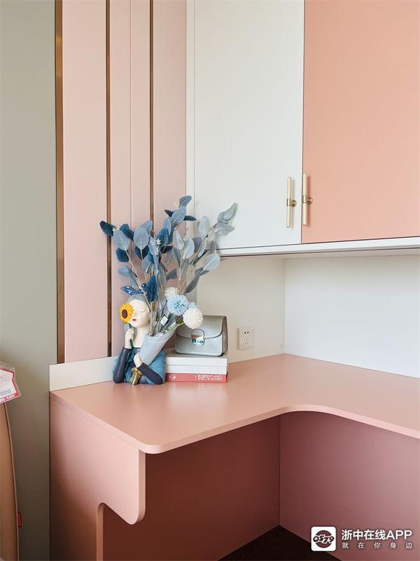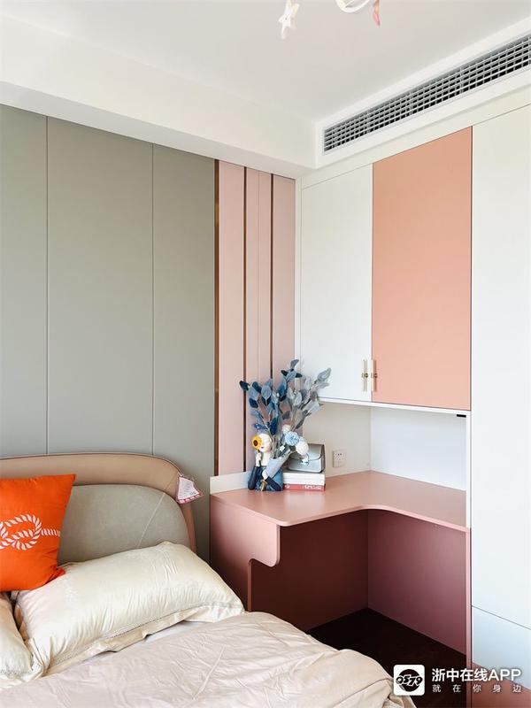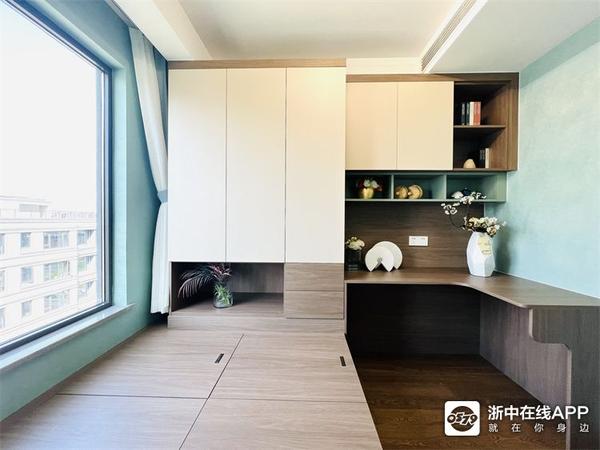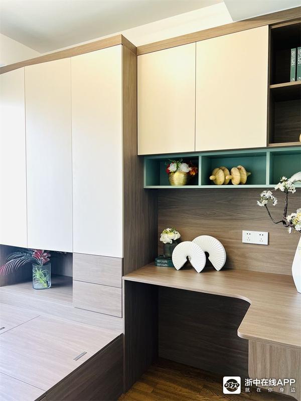 书房是一个榻榻米房,也做了一组圆弧的书桌,大人也有专属的办公空间啦~