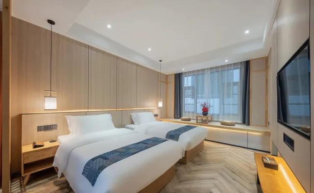民宿独栋庭院建筑,新中式风格客房,飘窗小茶座,配有空调、电视、衣柜、实木椅、全身镜、投影仪、自动窗帘、智能马桶,24小时热水,无线WiFi等。
