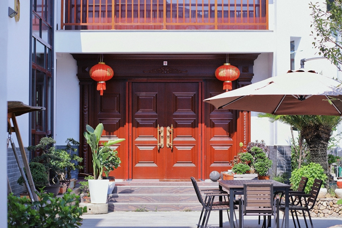 球莲民宿保留后现代主义风格,门口摆放绿植和缤纷的彩色花卉,随意摆放的几张桌凳,一把大大的遮阳伞和一张秋千椅组成了一个和谐温馨的小庭院。