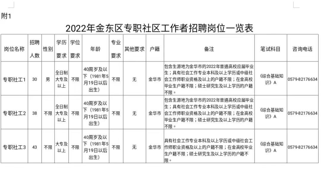 本次共计划招聘专职社区工作者136名,统一派往相关社区工作。具体招聘单位、岗位、人数和资格条件详见《2022年金东区专职社区工作者招聘岗位一览表》(附件1)。