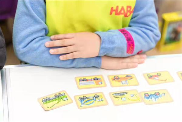 最先找到车辆卡片的小朋友要从桌子中间抢到建筑工人阿本,正确放置了所有卡片,就可以得到任务卡作为奖励。