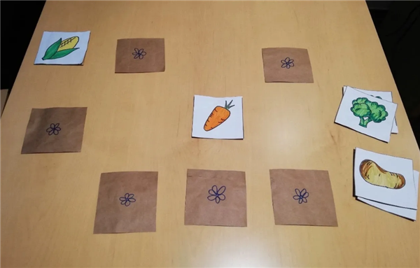 先观察记忆6组卡片,每种分别有两个一样的,依次按邻居顺序摆放,上面一排打开,记忆下面一排,记好后盖起来,老师说图案小朋友翻卡片。