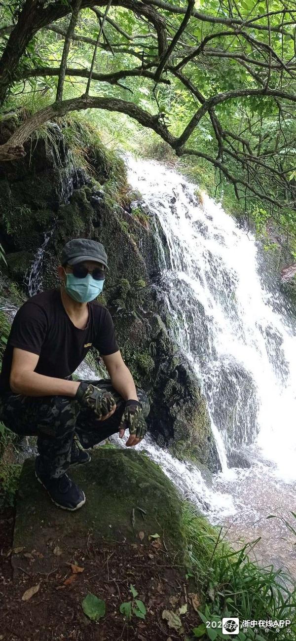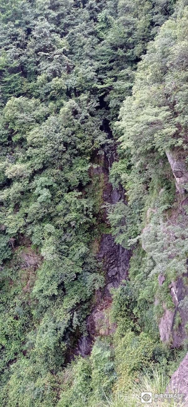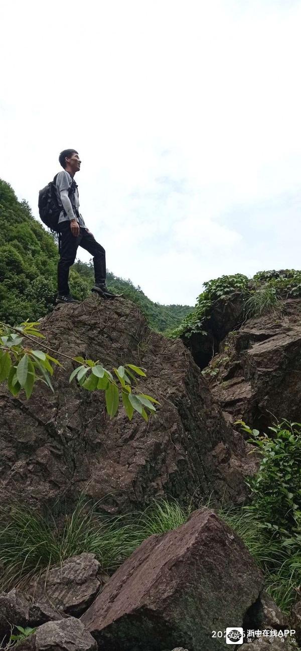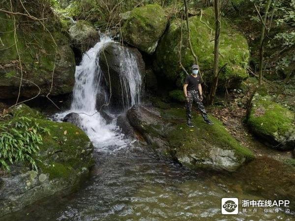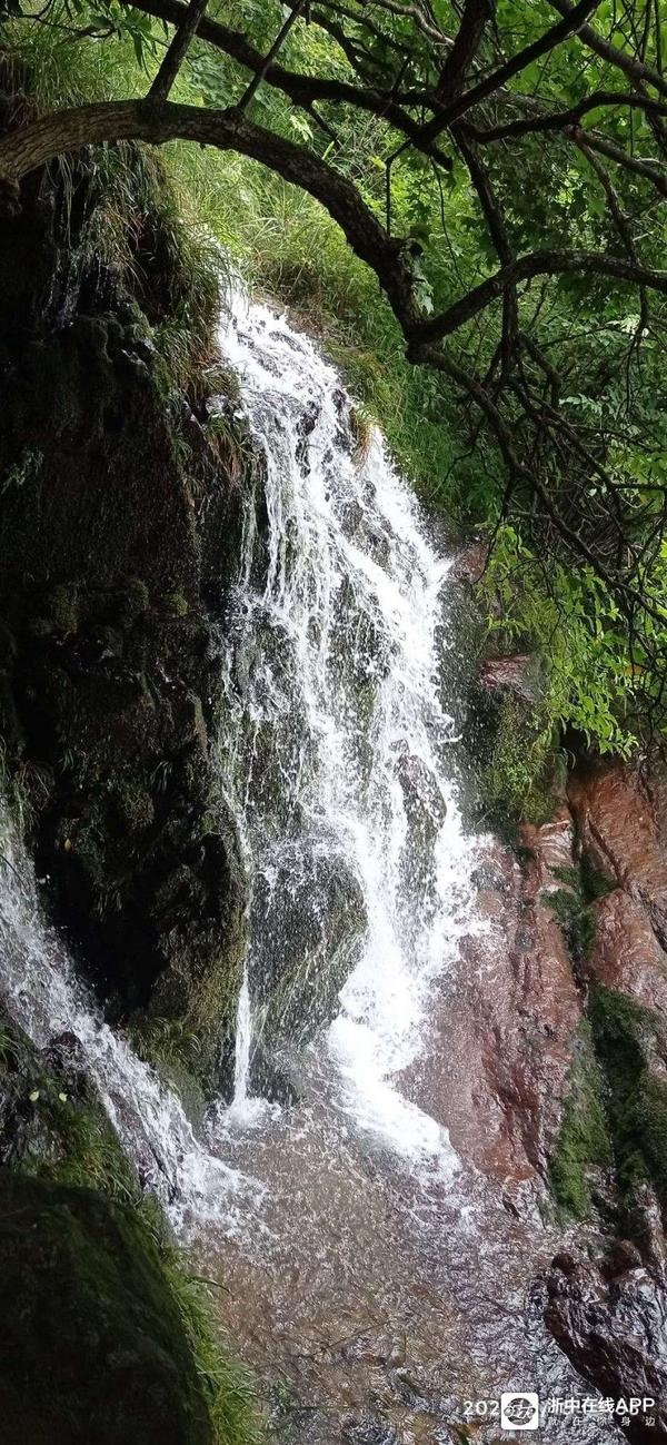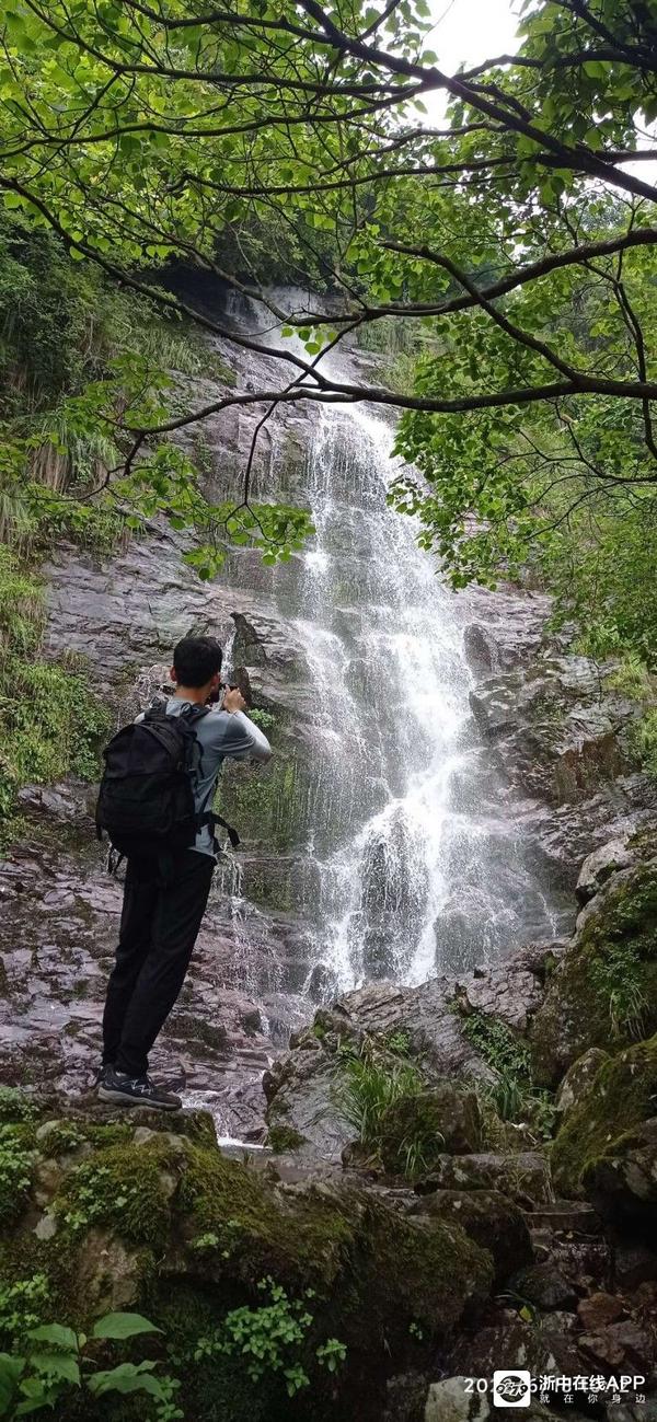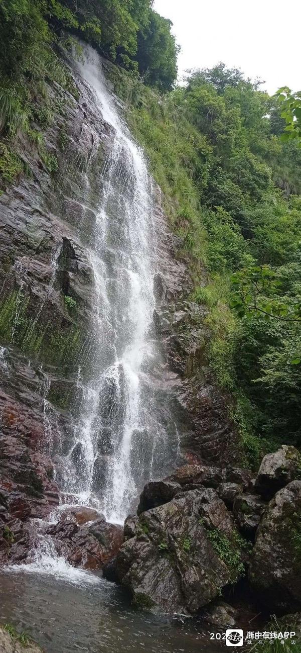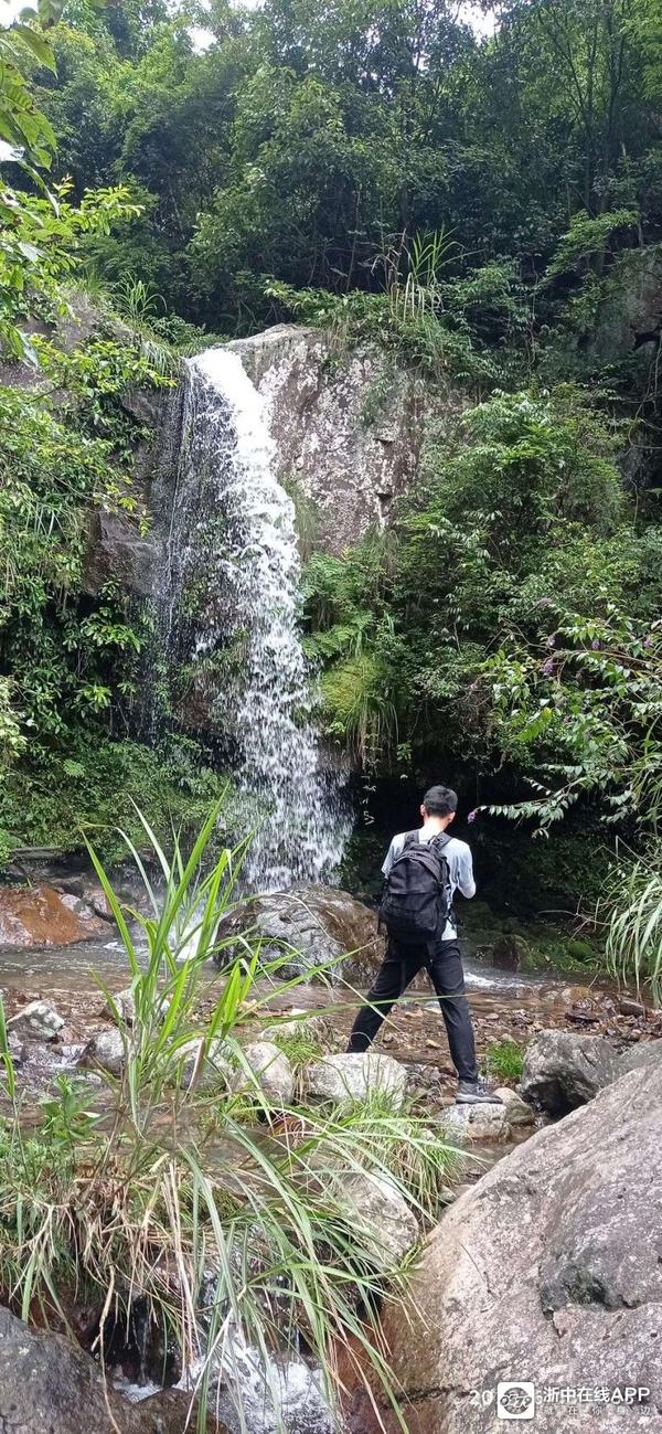 反正美景美它的,还是急着赶路要紧哇。走着走着,迎面上来二女一男三个拐杖党,但见他们走上坡路也很疲备了,但脚下却丝毫未停。群主问他们前方的大瀑布到了没有,他们边走边说快了,前面已不远了,说完自顾地一路朝我们来的路而去。看他们年纪都比我大,山路也比较陡,这么抗造倒是让我感慨了一番。还没等我完全感慨完毕,转了数个弯后,忽然前面有巨大的流水声冲击耳膜,说句言外话,写到这里我很想写下欲知后事如何,且听下回分解。可是此时就像当时听到的瀑布声那般肾上腺飚升了,刹不住车了。呃!我们寻声快步而下,左侧前面豁然开朗很多,但见得三四十个平方的水潭,水潭下方是几块落差较大突兀的巨石,上方的水从这些巨石中穿行,白练飞溅,而更上方,悬挂着的赫然就是那道登山界中流传甚广的金华北山第一瀑!
