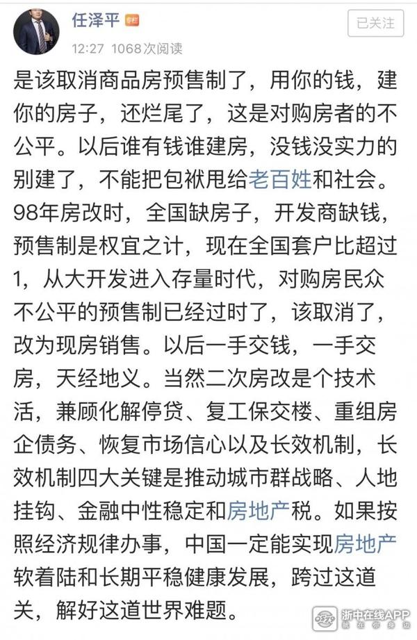 :取消预售暂时还不能做到,但可以提高预售的标准,预售许可证可以结顶以后才能申领,预售资金监管不要做个形式而是真正的监管起来,切实保障购房人的权益 (2022-07-14 12:56)