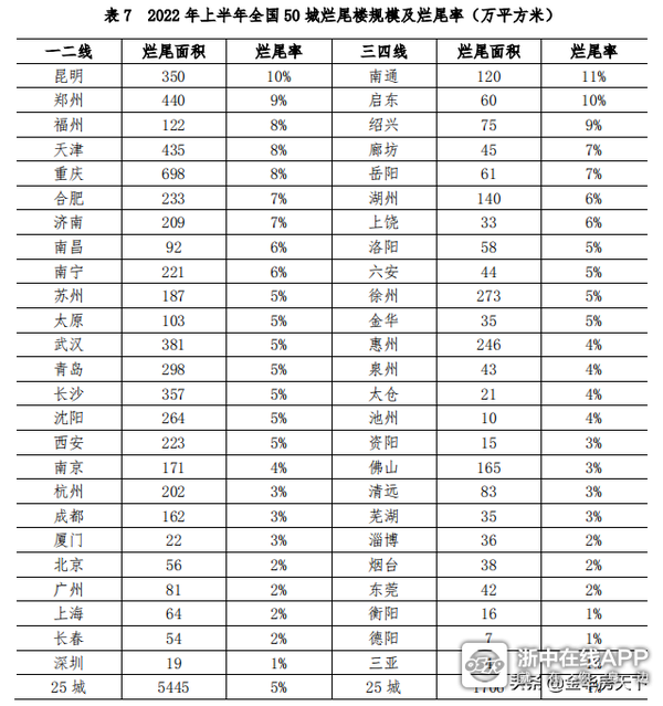 2022年上半年全国50城烂尾楼规模及烂尾率中,首当其冲的昆明烂尾率已达11%。