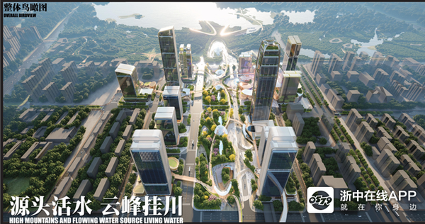 JAHN Architecture, Inc. +上海建筑设计研究院有限公司以“山水生境、双星争华”为设计理念,在这里复刻八婺大地的山水美图:两幢地标塔楼仿佛双星从天而降,其余高层塔楼分列南北仿佛南北双山,人字形主连廊呼应三江汇流的自然形态,延伸出二层步行系统仿佛涓涓细流,串联着象征八婺大地的八个地块。