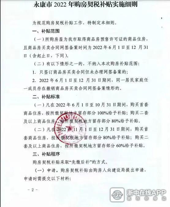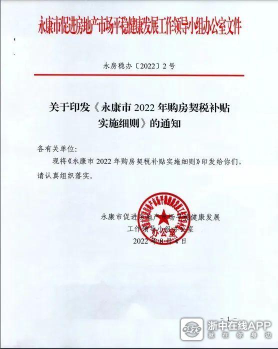 8月4日,永康市促进房地产市场平稳健康发展工作领导小组办公室发布《永康市2022年购房契税补贴实施细则》的通知。