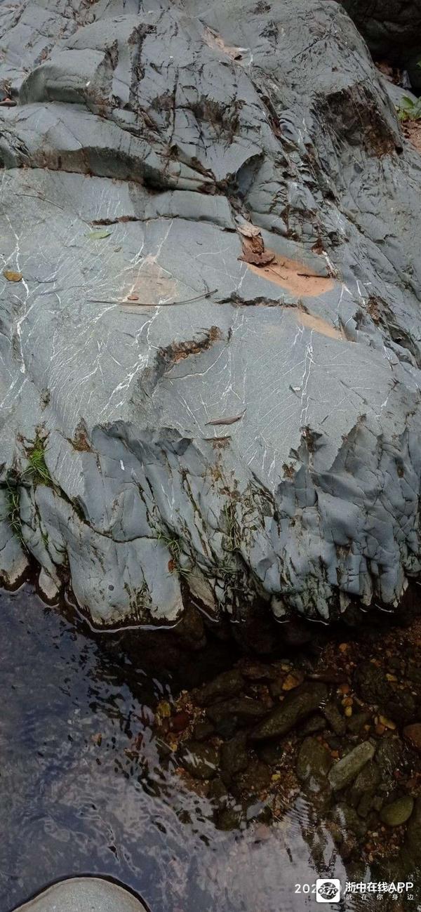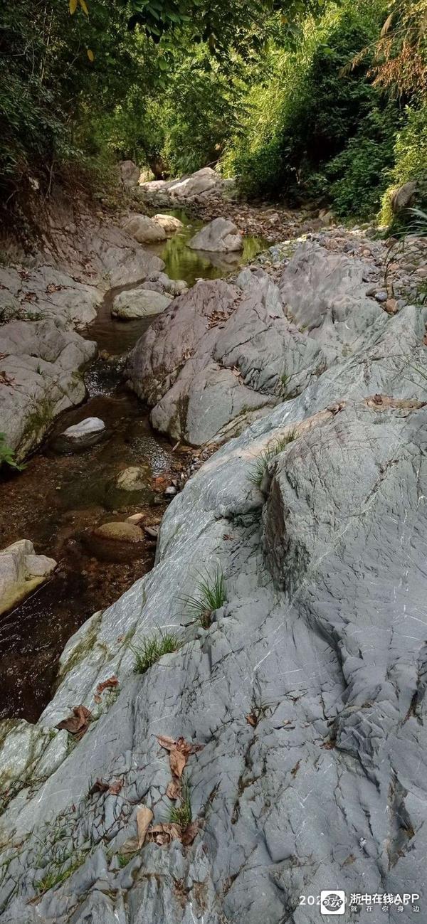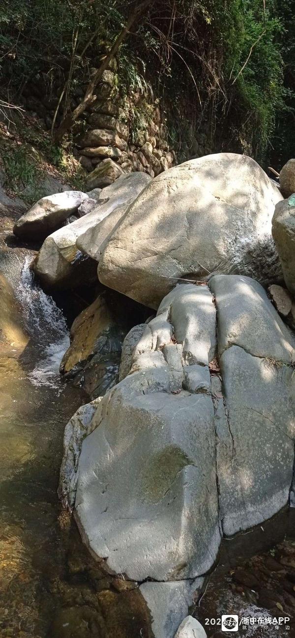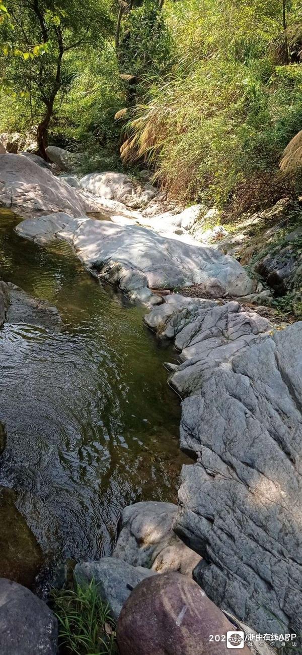 山涧里的巨石,有青色,褚红色,黑带白条纹的,也有花岗岩类巨大的。涧底有些地方由于水流的湍急,河床上无一砂石,平整而又光滑,因为略有起伏感,又相连于兀立水面或岸边凸起的巨石,显得景致非常的不同。不禁令人感叹其鬼斧神工。而岸边的草丛与树木上有枯叶蝶和绿蜻蜓在飞舞,自然和谐的生态使这里充满了活力。同伴说这些他都没见过。我说今后如果有了女朋友,一定带她到这里看看。
