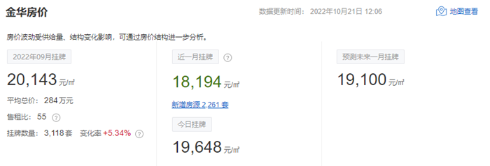 据全国房价行情网,2022年9月,金华最新二手房住宅挂牌均价20143元/㎡,环比上涨5.15%,平均总价为284万元,售租比55,挂牌数量3118套,变化率上涨5.34%。
