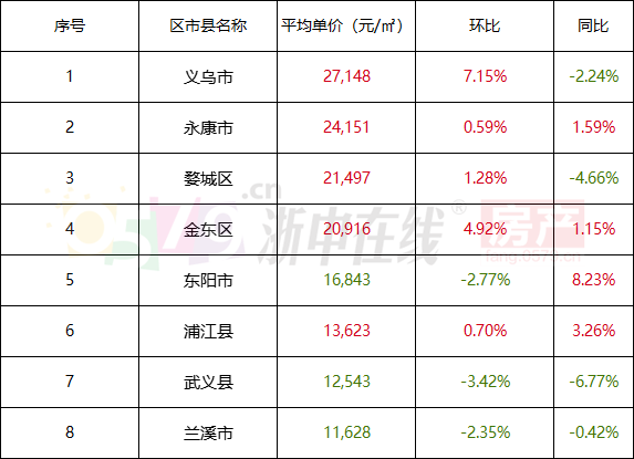 从金华各个县区二手房住宅挂牌均价来看,义乌房价最高,为27148元/㎡,较上个月环比涨7.15%。兰溪房价最低,为11628元/㎡,较上个月环比下跌2.35%。