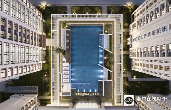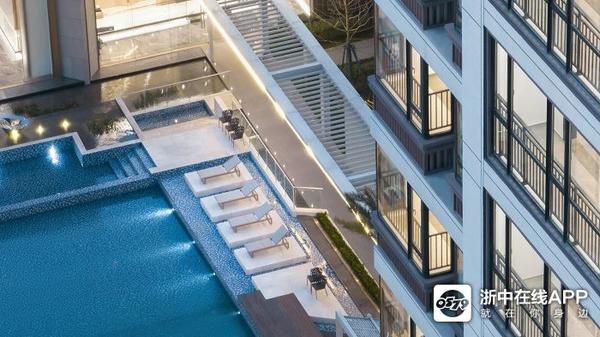 社区大堂前的水庭院以及后方的泳池水体聚气拢财,将风水藏在这两进归家空间,水平轴的尽端以雾森镜水面收尾。