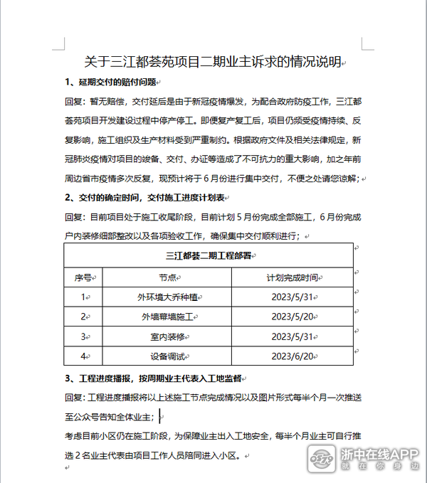 本来我是不想到论坛上发帖的,只是看了一下论坛上已经有两三个关于富力三江都荟的帖子,不少围观群众们都在盛传富力三江都荟烂尾了,本人作为业主在此申明我们没有烂尾,小区第二期交付在即。你说这个楼盘的开发商富力地产问题有吗?有!楼盘延期交付开发商难辞其咎!任何理由都不能改变为此对我们业主造成的损失!但是在三年疫情后全国楼市这个大环境下,很多楼盘都已经彻底躺平,我们依旧在加紧完善中。庆幸的是我们二期业主们非常团结,大家对我们自己楼盘金华小面积住宅NO1的地段是绝对有信心的,不要和我们说什么边上的吐司切片,他就在我们视线之下,视野和户型都不如我们。一个称为家的地方除了硬件,还有邻居们的和谐和有爱。我们整个群体积极介入到整个小区的后序交付的过程中,我们有大批邻居作为专业人士来把关自己房子质量,向开发商提出意见,即使交房了业主们也不用担心验房会疏漏自己房屋的质量问题,因为我们业主代表已经跟踪了几个月,任何细小问题都了如指掌,1500的装标(格里中央空调,空气能热水器,樱花油烟机,品牌窄边定制铝合金磨砂厨卫门)这个效果在金华我们不亏!当然我发这个贴的目的也不是吹嘘我们自己房子有多好,开发商也就那样了,质量我们盯着也不会差!开发商各种房屋押金都在监管账户呢,我们怕啥!后序的延迟交付的违约金我们一定会问开发商讨要!我们有过硬的硬件和地段,我们有一群团结一致的邻居,我们的房子不会烂尾,终会绽放。目前我们小面积公寓有两个群将近800人,还有很多业主朋友没有加入我们的群,与其在负面信息流里挣扎不如一起来出一份力,共同监督质量,期盼交付,维护权利。