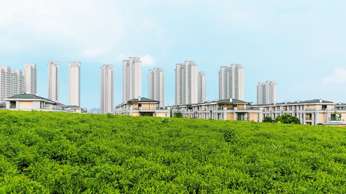 宾虹星城在宾虹西路南侧,BRT2、4号线可直达,它的西部是约7.9平方公里的云涧湖湿地公园,生态环境优越,包含1300亩茶园、1500亩水库和9000亩左右的林场,是妥妥的天然氧吧了。出了西门就是茶园哦,这才叫真正的零距离后花园嘛!