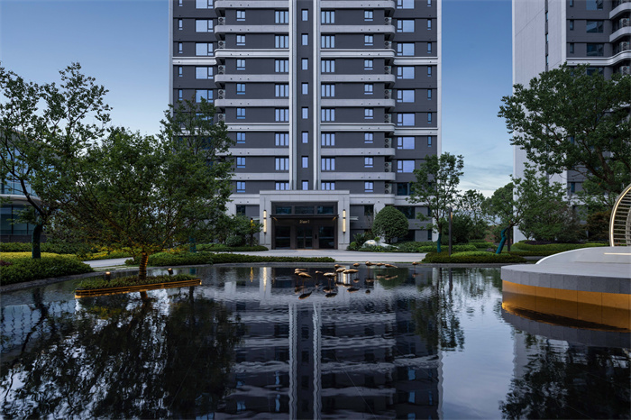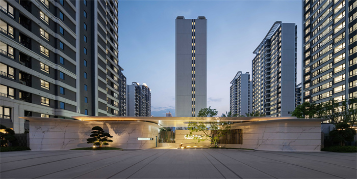 素白、优雅的曲线景墙构成了小区的大门,一眼就能瞥见迎客松和乌桕树分列两侧,大气开阖,一整个归家仪式感就来了。