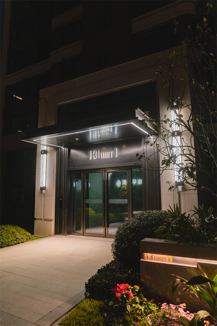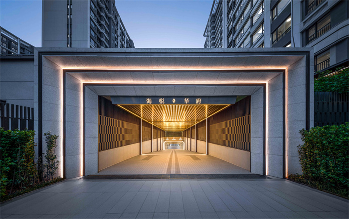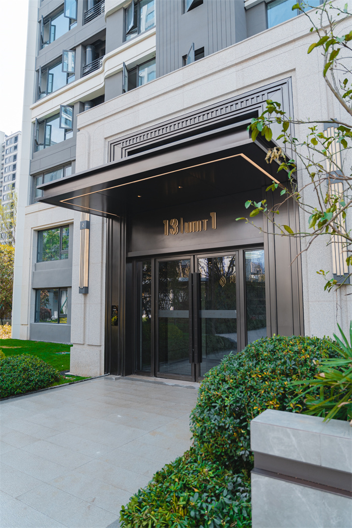 入户单元门头使用低奢的“枪灰色”铝板加上石材包裹,这是一个人脸识别的电动门,单元楼门牌也使用嵌入式灯带来凸显线条美感。