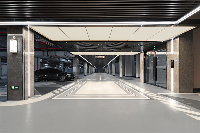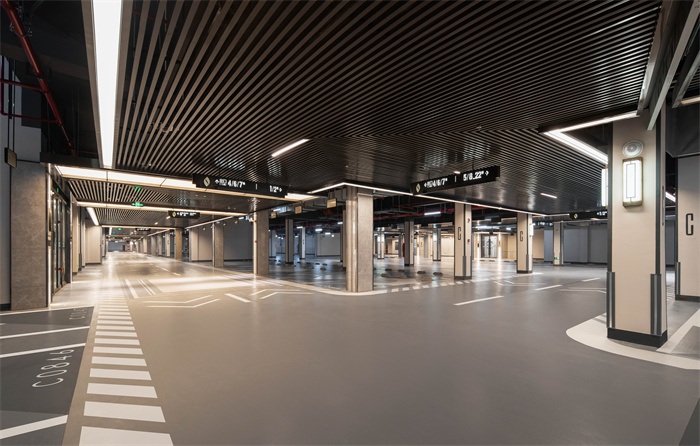 线性灯带吊顶、亮化指示灯、车行道壁灯都是满满的细节。铝方管吊顶搭配嵌入式线型光源,装饰照明二合一,线条和角度的美感算是给他玩儿明白了。
