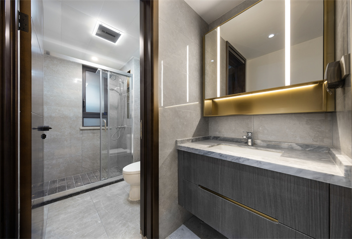 贵气精致的金色金属踢脚线、区分功能空间的石质门踏板、内凹式冰箱插座、移动插座、阳台赠送晾衣架、厨房下拉式抽屉壁柜、水槽洗碗机...无不体现着他的人性化细节。