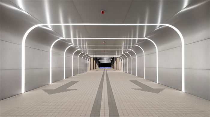 整个车道以内嵌灯带进行亮化处理,铝板包裹的车道像不像是一条可以穿越到未来的时光隧道。