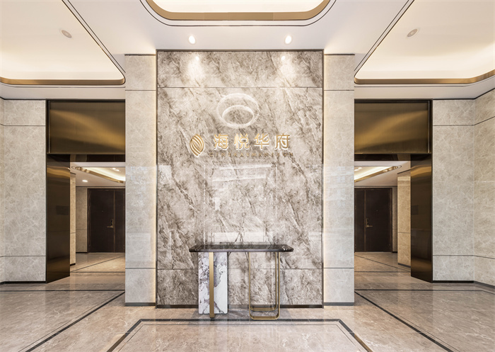 入户门厅,稳重奢华,地面双波打线勾勒,吊顶采用金属双眉线打底,背景岩板搭配自带光源的LOGO,立体感十足!