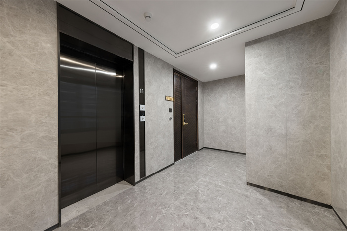这是一梯一户的入户门厅,黑色不锈钢镜面包裹的电梯,波纹木饰面的钢木复合门,无一不显示着住在这业主的尊贵。