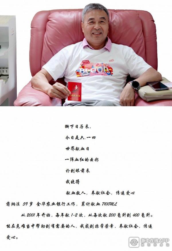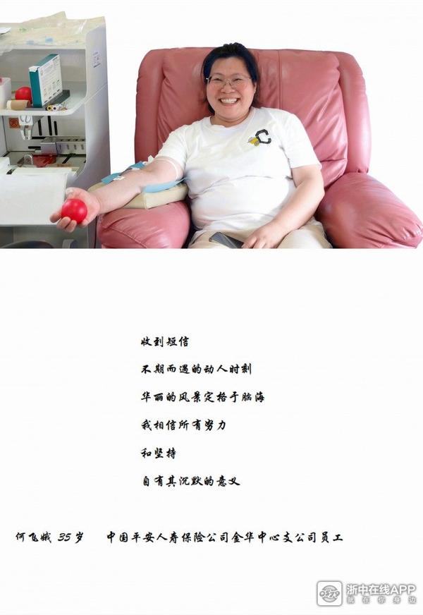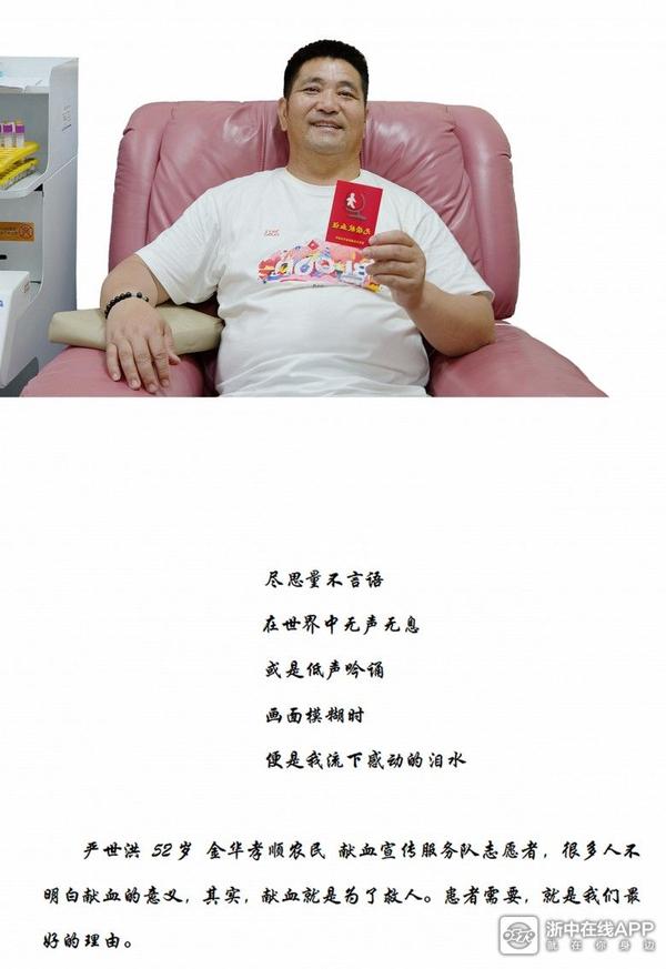 有的人因为一次街头献血车的偶遇,有的人是因为企业组织献血,您呢?您是为什么参与无偿献血?金华献血志愿服务队队长严世洪,认认真真给我写下的答案是:因为需要安全血液拯救生命和改善健康。