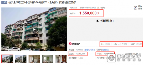 据悉,该法拍房位于金华市江滨小区2幢3-606室(含附房及室内固定装修),建成于1994年,总层数为6层,所在第6层及附房。室内布局为2室2厅1厨1卫带阳台,建筑面积62.47㎡,附房面积12㎡,混合结构,南北朝向,用途为住宅,土地使用权面积:10.02㎡,土地使用权终止日期2063年06月07日,无租赁。