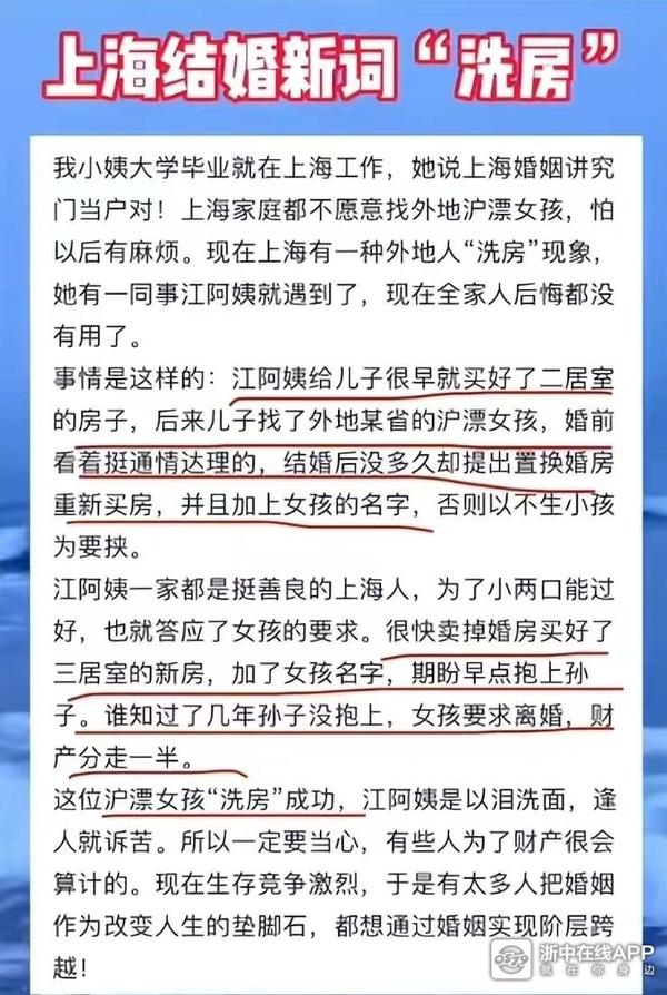 之前一直不理解为什么北京和上海人,在找对象的时候只找本地的,不喜欢外地的,现在终于明白了。现在大龄未婚的男生女生都挺多的,通过自由恋爱结婚没有问题,当你们要通过相亲来找到自己人生的另一半时,谨慎处理好婚前财产,可以在婚前做财产认证,避免出现“洗房”现象。
