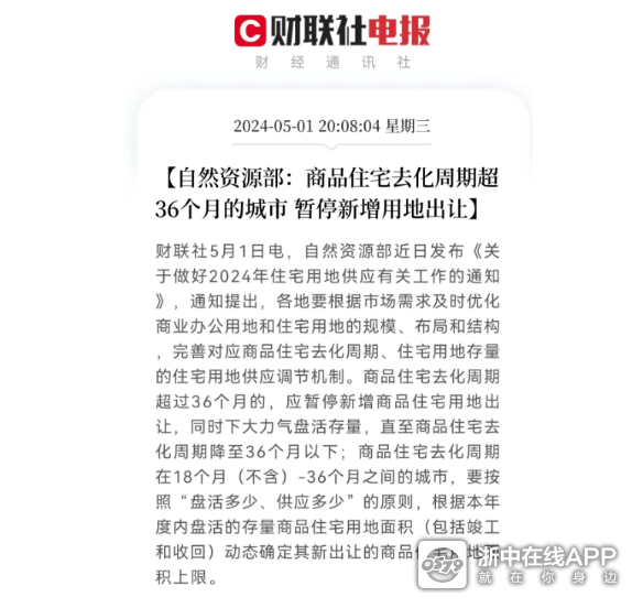 政策明确,商品住宅去化周期超过36个月的城市,应暂停新增商品住宅用地出让,同时下大力气盘活存量,直至商品住宅去化周期降至36个月以下。