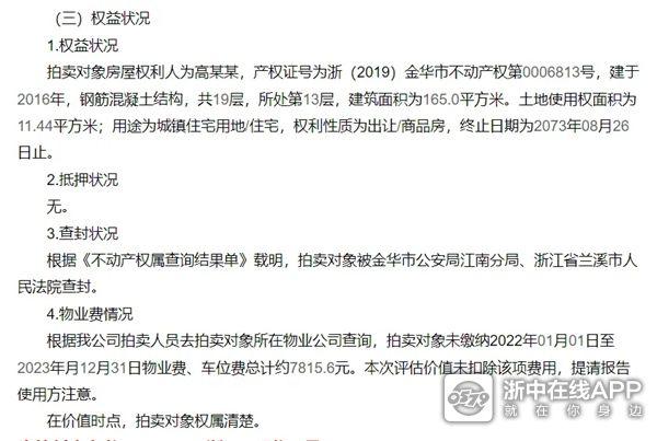 拍卖对象:位于金华市兰溪街1500号保集湖海塘庄园1-75幢802室住宅房产,钢混结构,主朝向朝南,建成年份2018年,房屋总层数32层,位于第8层。防盗门入户,室内布局为四室二厅一厨三卫带阳台,现为毛坯房;水电卫等配套管线已预埋,室内未装修。房屋建筑面积191㎡,土地使用权面积7.37㎡,用途为住宅,性质为出让。