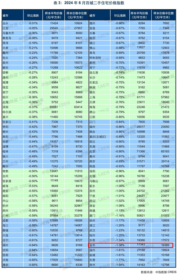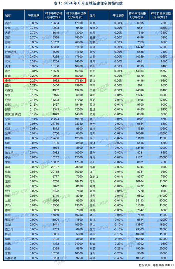 房价上,月初公布的《2024年06月百城新建住宅价格指数》显示,全国百城64个环比上涨,环比下跌的城市有36个,其中金华新建住宅样本平均价格12952元/㎡,环比上涨0.29%,涨幅在百城之中位列前13位,省内仅嘉兴新建住宅的环比涨幅排在金华前面。