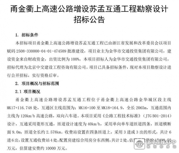 9月23日,甬金衢上高速公路增设苏孟互通工程勘察设计招标预公告发布。