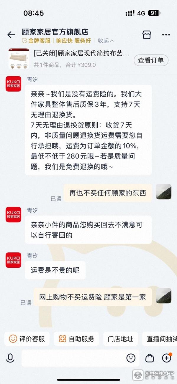 网上卖东西运费险都不买、大家有遇到过吗?还是大件商品。顾某家?只顾自家? 不顾消费者家? 网上购物不就图省事省心么、这点保障都没有、在网上开什么店呢? 幸亏装修没买他家颗粒板柜子、颗粒板价格跟人家高定品牌一样的价格。