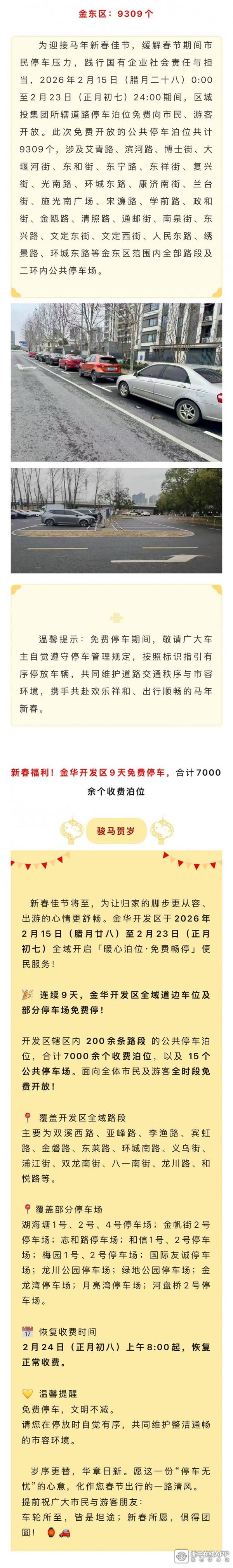 春节假期金华市区这些地方免费停车!