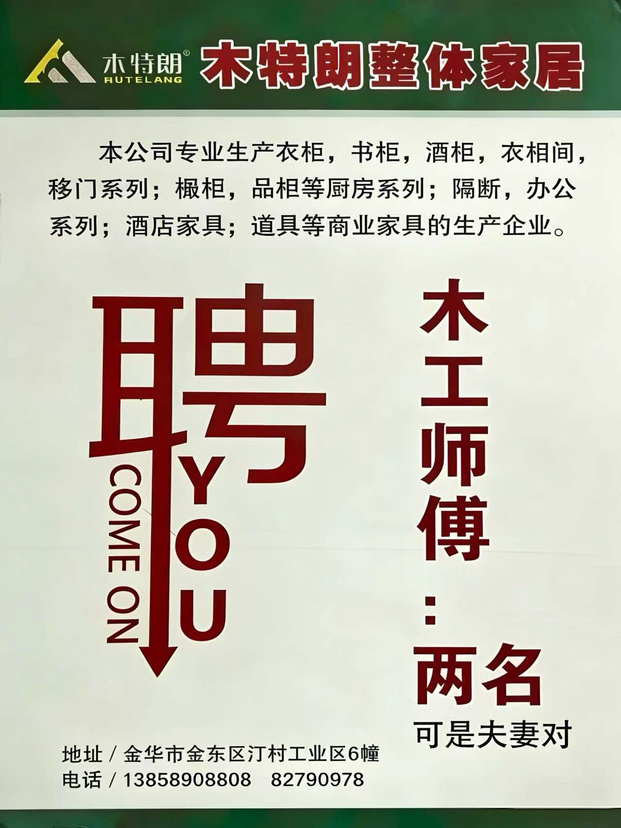 金华木特朗全屋定制工厂诚聘木工师傅 感兴趣电话联系