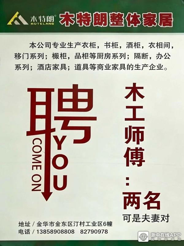 金华木特朗全屋定制工厂诚聘木工师傅